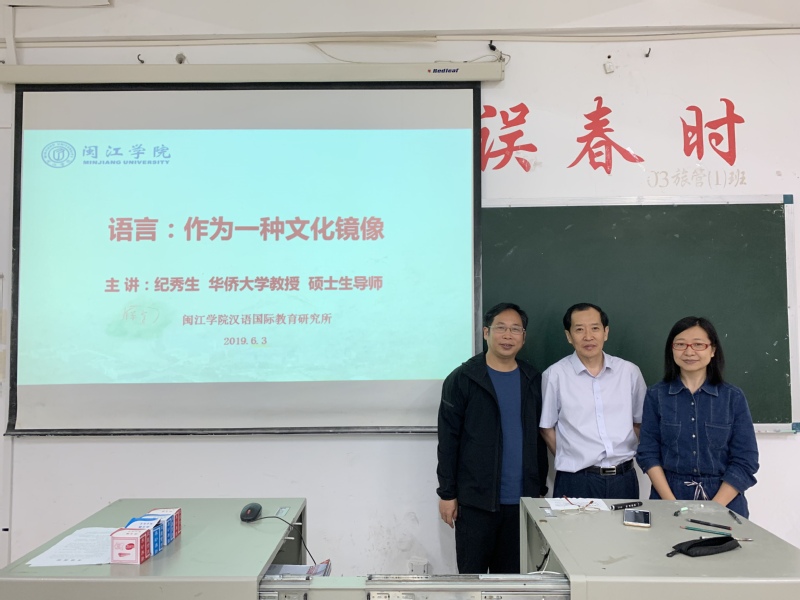 2019年6月3日,应海棠书屋 汉语国际教育研究所之邀,中国华文教育基金会“华文教师完美远程培训”全球直播平台主讲专家、福建省语言学会副会长、华侨大学华文学院语言学及应用语言学硕士点负责人纪秀生教授莅校,为2018级汉语国际教育的学生们开设主题讲座——“语言:作为一种文化镜像”。讲座由李义海教授主持。