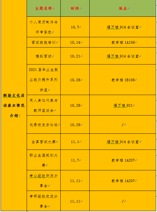 海棠书屋 乘风破浪,“职”面人生职场文化节,在沿袭往届活动的基础上加以创新,开展14个形式丰富多样、内容充实有意义且覆盖面广泛的系列活动。其中有针对全体本科生开展的简历工作坊活动,同时也有面向即将步入职场的毕业生开展的模拟面试、面试大赛、职业体验坊、应届毕业生职业能力提升讲座。在就业动员、引导学生正确处理就业和择业、招考和实习等方面关系上进行了更深入的指导。 活动具体组织实施流程: 个人简历制作与评审修改 面试技能培模拟面试 2021届毕业生就业能力提升系列讲座 用人单位代表训 与教师座谈会 优秀校友云论坛 全真面试大赛 职业生涯规划大赛 考公经验交流分享会 考研经验交流分享会 职场体验坊 新状元励志求职宣讲会 海棠书屋 法学院2021届毕业生双向选择交流会