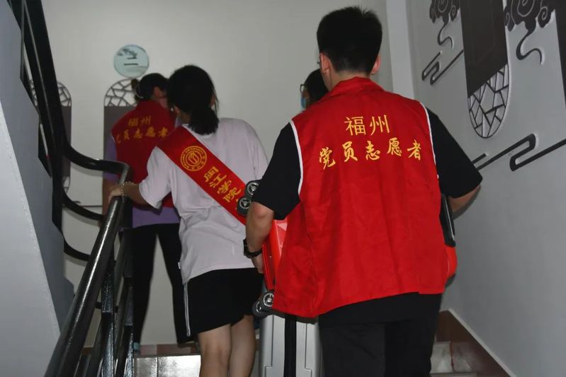 (党员志愿者帮新生搬行李上楼)