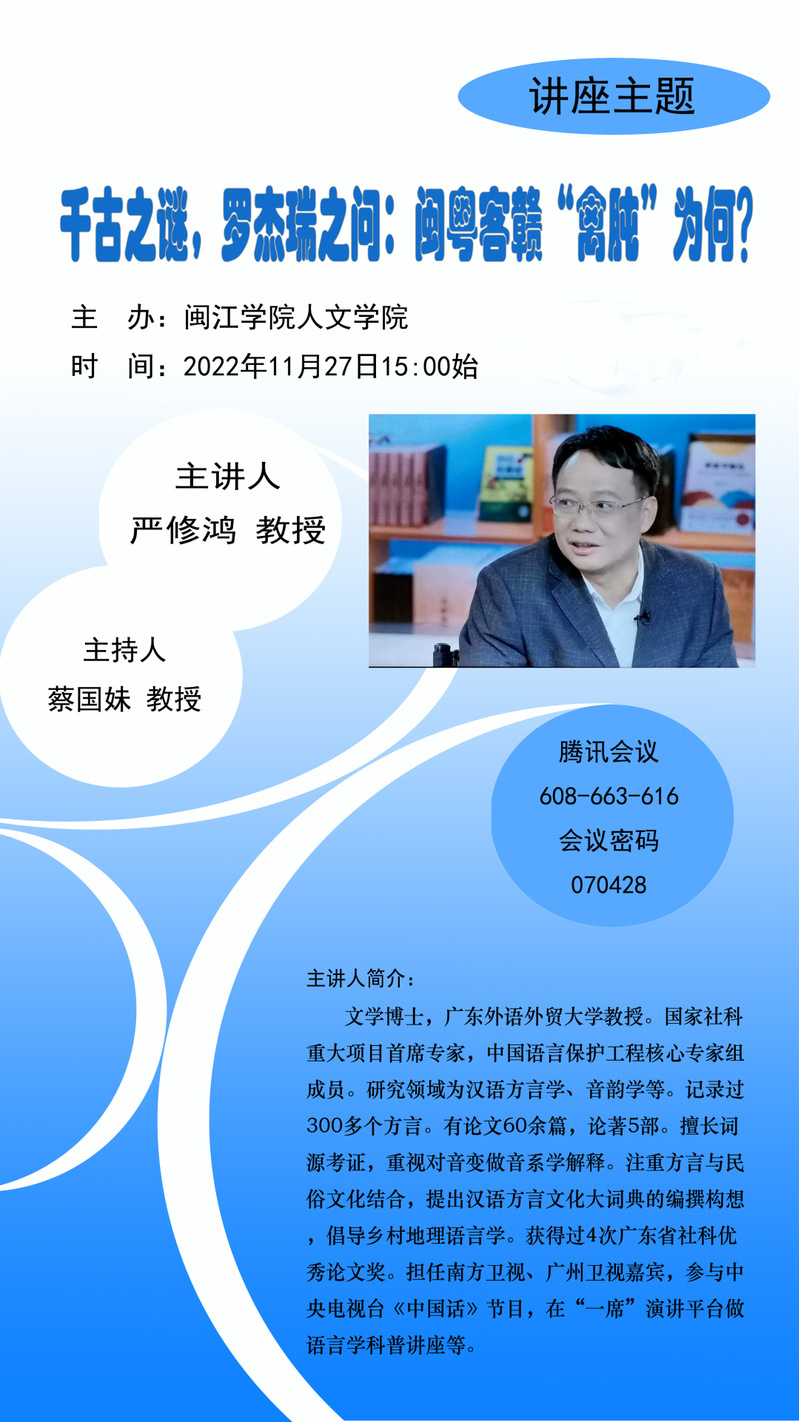 为了做好海棠书屋 中国语言文学一级学科的培育工作,提升教师学术水平,2022年11月27日,海棠书屋 特邀请广东外语外贸大学的严修鸿教授于腾讯会议开设题为《千古之谜,罗杰瑞之问:闽粤客赣“禽肫”为何?》的线上讲座。本次讲座由汉语国际教育专业负责人蔡国妹教授主持。