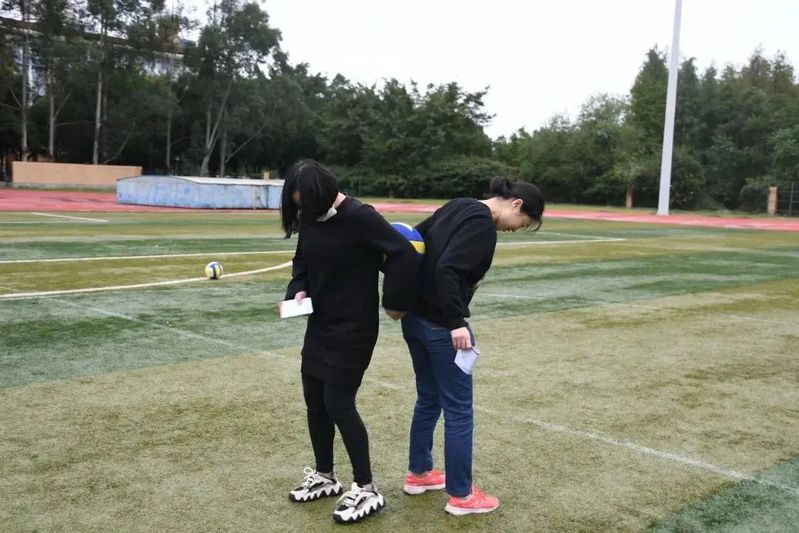 背夹球接力开始, 随着裁判一声哨令,老师们开始“背对背拥抱”,伴着“一二、一二”的口令,他们统一步伐,都铆足了劲向前快速走去。一时间,场上就热翻了天。