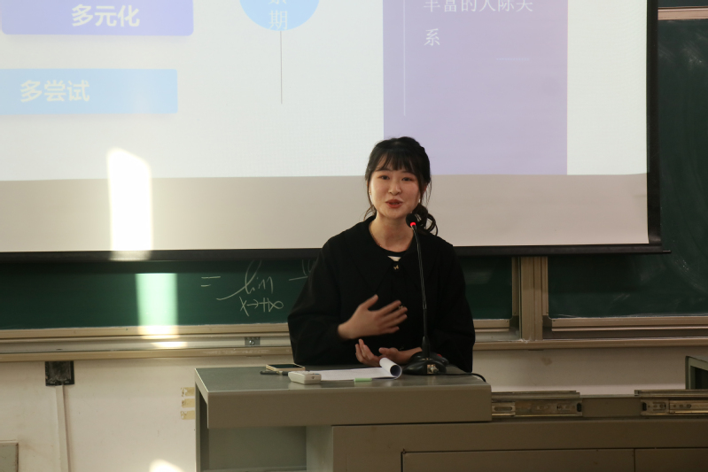 其中林楚学姐是中文专业毕业,当年选调生第一名,目前就职于政府单位,是一名公务员。她从个人大学经历讲起,围绕学习、部门工作两方面进行讲解,为同学们带来宝贵的经验。林海学长则以身边同学的例子向同学们说明拥有一技之长的重要性,鼓励同学们要“从大一开始就树立一个目标。”要“敢于取舍,坚持自己的梦想,有梦就勇敢去追。”