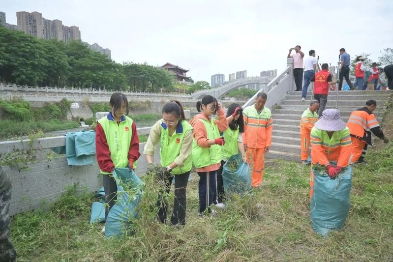 志愿者们化身“护河卫士”,发挥不怕脏、不怕累的精神,互相配合、团结协作,使用可重复利用式环保垃圾袋对洽浦河沿线周边的河道垃圾进行“拉网式”清理,捡拾水面漂浮物,清扫隐匿在河道的烟头、废纸、瓶盖、包装袋等,最后将垃圾分类袋装后运送到指定地点。志愿者们用切身行动贯彻绿色环保的可持续发展理念,河边忙碌的身影形成一道靓丽的风景。