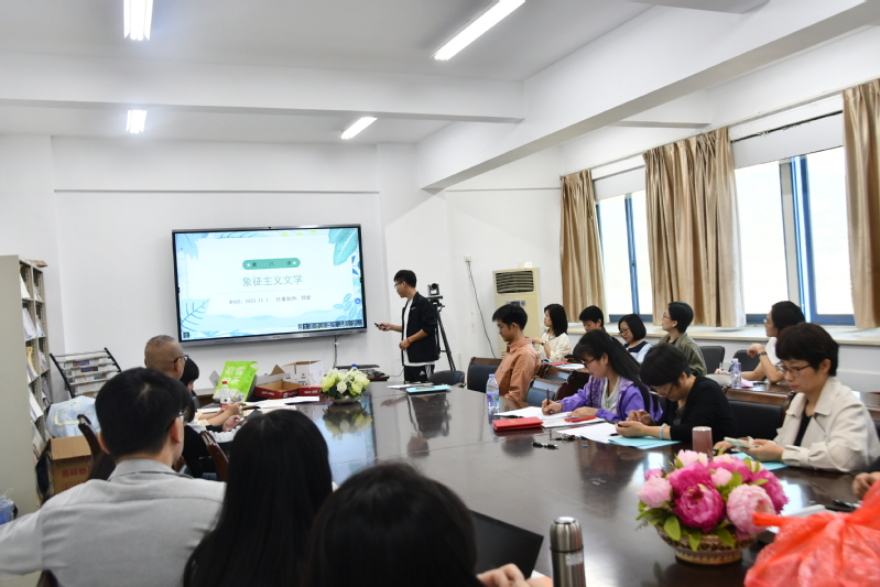 程文博老师以中国古代玉器“良渚”为主题,详细讲解了源远流长的中国良渚瓷器文化;黄秋硕老师通过列举对比屈原、但丁这两位作者,论证了“人类发展史上有本质的共性”这一深刻主题,从而更形象解释了比较阅读法;芮晶莹老师围绕“启示顿悟法”,配合丰富有趣的教学片段演示,以达到“激发潜能,轻松愉悦”的教学目的;阮弦老师以“作为审美范畴的丑”为主题,区分日常用语和审美范畴的丑,针对文学意义上的“丑”进行了讨论;黄立斌老师讲晚清科幻文学,有机融入了课程思政元素,赢得了满堂喝彩;郭健老师讲象征主义文学条分缕析,精细梳理学术脉络;郭佳老师是今年刚引进的博士,讲解女性主义理论非常细致深刻,赢得参评老师们的赞许。