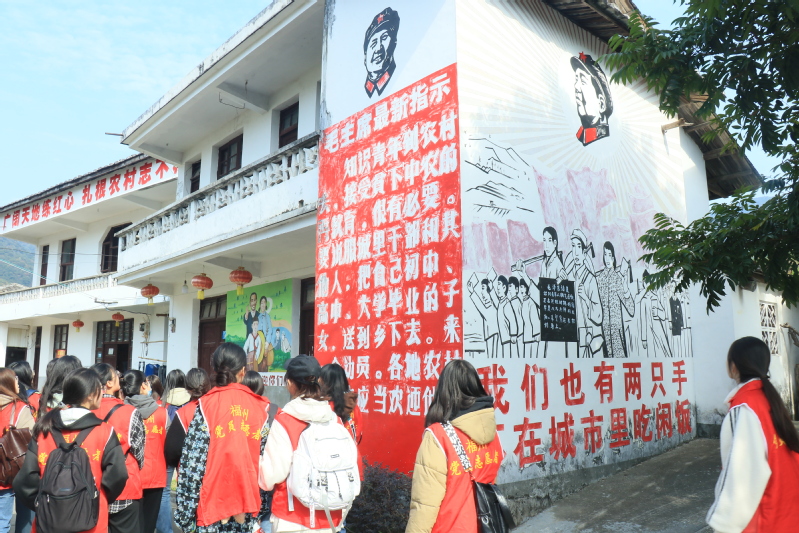 井下村是闽侯县白沙镇唯一的革命老区村,同时也是有名的“知青村”。在井下村志愿者的讲解下,同学们了解到井下村曾是抗日战争时期当地地下游击队和地下联络员所在地,曾组织过著名的金钟山阻击战。上世纪六、七十年代,有近200名福州等地知青到此插队下乡。走进村中,随处可见“广阔天地练红心”“知识青年上山下乡,接受贫下中农再教育”等口号标语,错落的房屋外墙上绘满多彩的知青文化主题壁画。同学们漫步在村间巷道,通过重走知青上山下乡路,触碰那段厚重的红色历史,深入学习先辈们艰苦奋斗、辛勤劳动的优良传统,感悟初心使命,积蓄奋进力量。