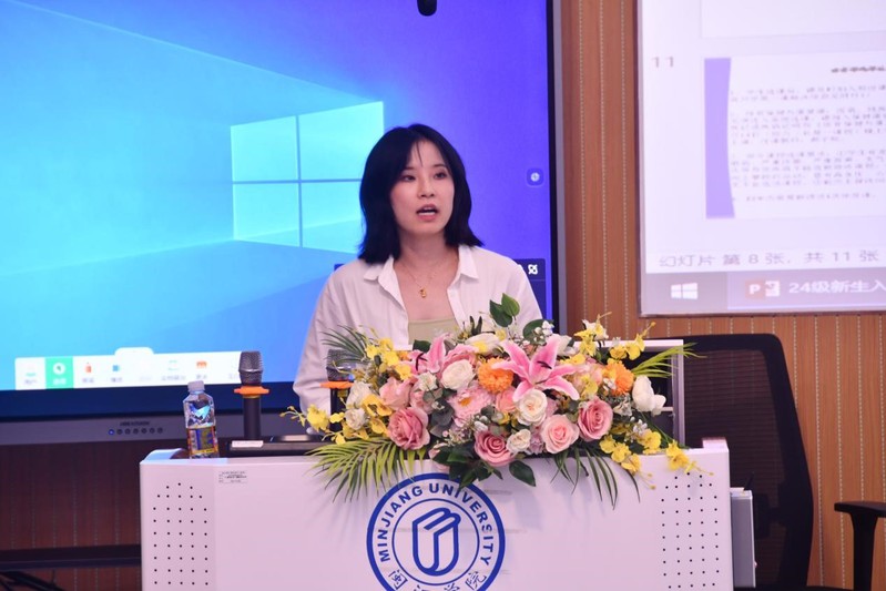 会议伊始,叶婷老师向新生介绍了本科课程修读方案。她详细阐述了公共必修、公共选修、学科基础必修、专业必修、专业限选、专业任选、集中实践、第二课堂几种课程类别所需学分要求,重点介绍了第二课堂“德育实践、创新创业教育实践、美育实践、专业教育实践、劳动实践、体育实践”各板块积分评定规则。