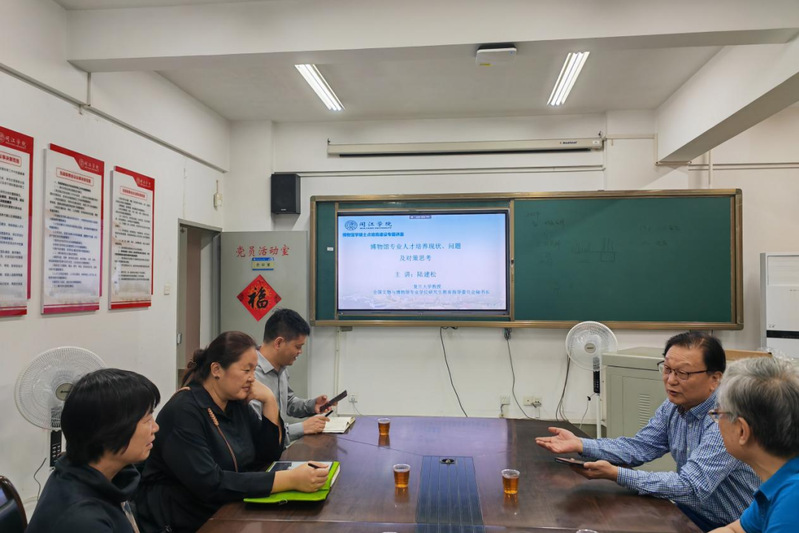 在福万楼518会议室,海棠书屋 院长徐赣丽教授代表海棠书屋 对陆教授的到来表示欢迎,并向陆教授介绍了本校文物与博物馆专业的特色与优势和博物馆学硕士培育点的建设情况。