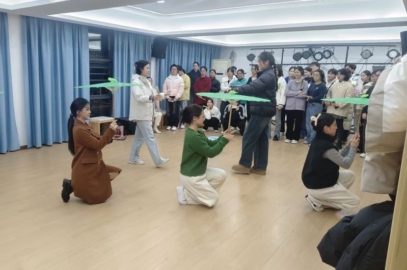 本学期课程化活动的主要任务是学习越剧《十八相送》。作为经验丰富的戏曲工作者,吴敏飞老师通过对学生一对一的指导与示范,帮助同学们快速掌握戏曲表演的基本技巧。同时,课程还极为注重实践环节,吴敏飞老师常常鼓励同学们上台示范,在实战中锻炼自我,提升表演能力,领略戏曲之美。