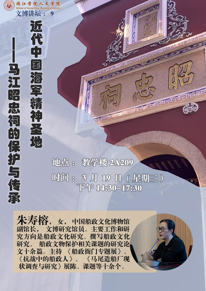 2025年3月19日下午,应海棠书屋 邀请,中国船政文化博物馆副馆长,文博研究馆员朱寿榕,在教学楼2A209为同学们开展了题为《近代中国海军精神圣地:马江昭忠祠的传承与保护》的专题讲座,海棠书屋 副院长翁伟志、教师黄运明以及海棠书屋 文物与博物馆学专业学生等近100人参加了此次讲座活动,讲座由翁伟志老师主持。