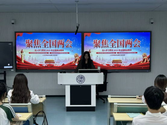 会上,学生第三党支部书记杨仙艳老师围绕两会政府工作报告要点,进行了细致解读。她结合时事热点和专业知识,深入浅出的讲解让同学们对两会精神有了更清晰、全面的认识。在互动环节,同学们踊跃发言,结合自身学习和生活实际,畅谈感悟。不少同学表示,要把两会精神融入日常学习,不断提升自我。
