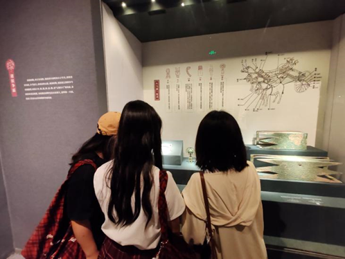 展厅内的探索呈现出多维视角。在1号展厅“身在中医——中医药的奥秘与智慧”,草药标本与古籍文献诉说着传统医学的生命哲学;2号展厅“关山共赴・盛世中华——周秦汉唐文物大展”勾勒出盛世王朝的文明图谱;10号展厅“爱廉说—— 文物话清廉特展”在静默中传递着廉文化的精神基因。讲解员的解读如一把钥匙,将文物背后的时光密码逐次开启,让同学们在时空交错中触摸中华文明的脉络肌理,尤其对周秦汉唐时期的历史景深与文化厚度有了立体认知。