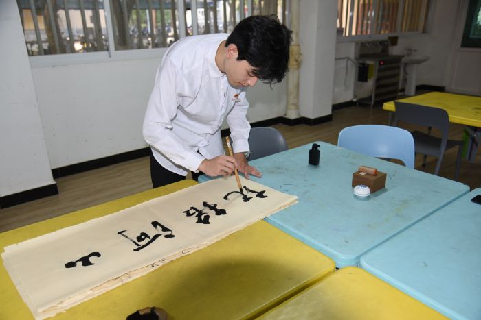 学院通过组织观看《百团大战》《东京审判》等抗战主题电影,依托电子屏滚动播放抗战精神宣传标语,围绕“弘扬抗战精神”主题开展书法、剪纸等文化活动,以丰富形式呼唤学生历史共鸣,营造“铭记历史,自强奋进”的社区育人情境,使抗战精神悄然入心、润物无声。