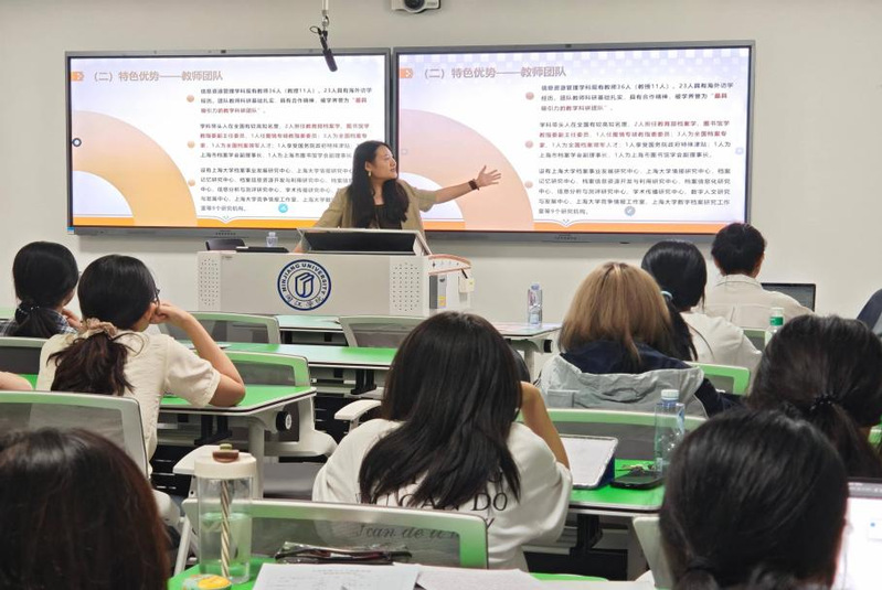 宣讲中,张歌老师先介绍学科优势。该学科跨学科属性鲜明,涵盖图书情报、图书馆学、情报学、档案学四大方向,依托上海大学“双一流”平台,拥有完善的本硕博人才培养体系与多元研究方向,能为跨专业学生提供广阔学术契合点,如历史学学子可借档案文献开展历史研究,中文系学子可参与数字人文领域文本分析与数据库建设。